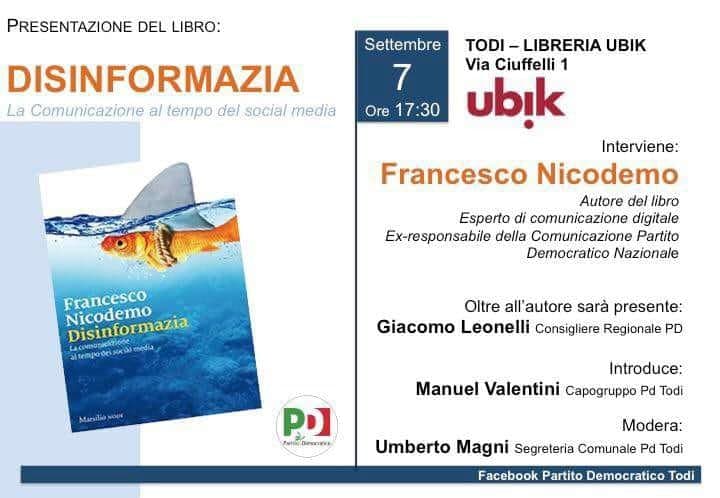 Un libro importante e dal riscontro di pubblico notevole, scritto da uno dei massimi esperti di comunicazione digitale italiani, nonché responsabile, nel 2013-2014, del dipartimento comunicazione del Partito Democratico e Consigliere di Gentiloni a Palazzo Chigi nello staff del Presidente del Consiglio. Un saggio che si destreggia abilmente tra fake news e polarizzazione mediatica, trattando i temi più caldi dei rapporti che legano attualmente comunicazione e politica. Un vero e proprio antidoto alla paura, visto che l’autore è conscio non solo dei rischi, ma anche delle opportunità offerte dai social media. Opportunità che, ultimamente, il Partito Democratico non è stato in grado di cogliere a pieno. L’incontro vedrà anche la presenza del consigliere regionale PD Giacomo Leonelli, L’introduzione sarà a cura di Manuel Valentini (Capogruppo PD in Consiglio comunale), mentre a moderare l’incontro sarà Umberto Magni (membro della segreteria comunale).