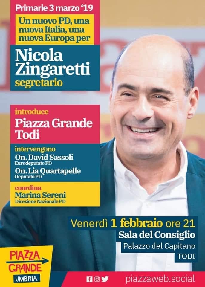 L’avvio della campagna per le primarie nel PD assume subito particolare rilevanza con un incontro programmato dai sostenitori tuderti della candidatura di Zingaretti. I relatori sono certamente due personaggi di rilievo: David Sassuoli è il vicepresidente uscente del Parlamento europeo, al secondo mandato in Europa, dopo essere stato, nella passata legislatura, capo delegazione del PD nel Parlamento europeo. Sassuoli è ricordato anche per essere stato speaker nel telegiornale di RAI1 e vicedirettore della stessa testata. Lia Quartapelle è deputato alla seconda legislatura ed è ricercatrice all’ISPI, l’Istituto per gli studi di Politica Internazionale di Milano, dove ha ricoperto il ruolo di responsabile del programma Africa.