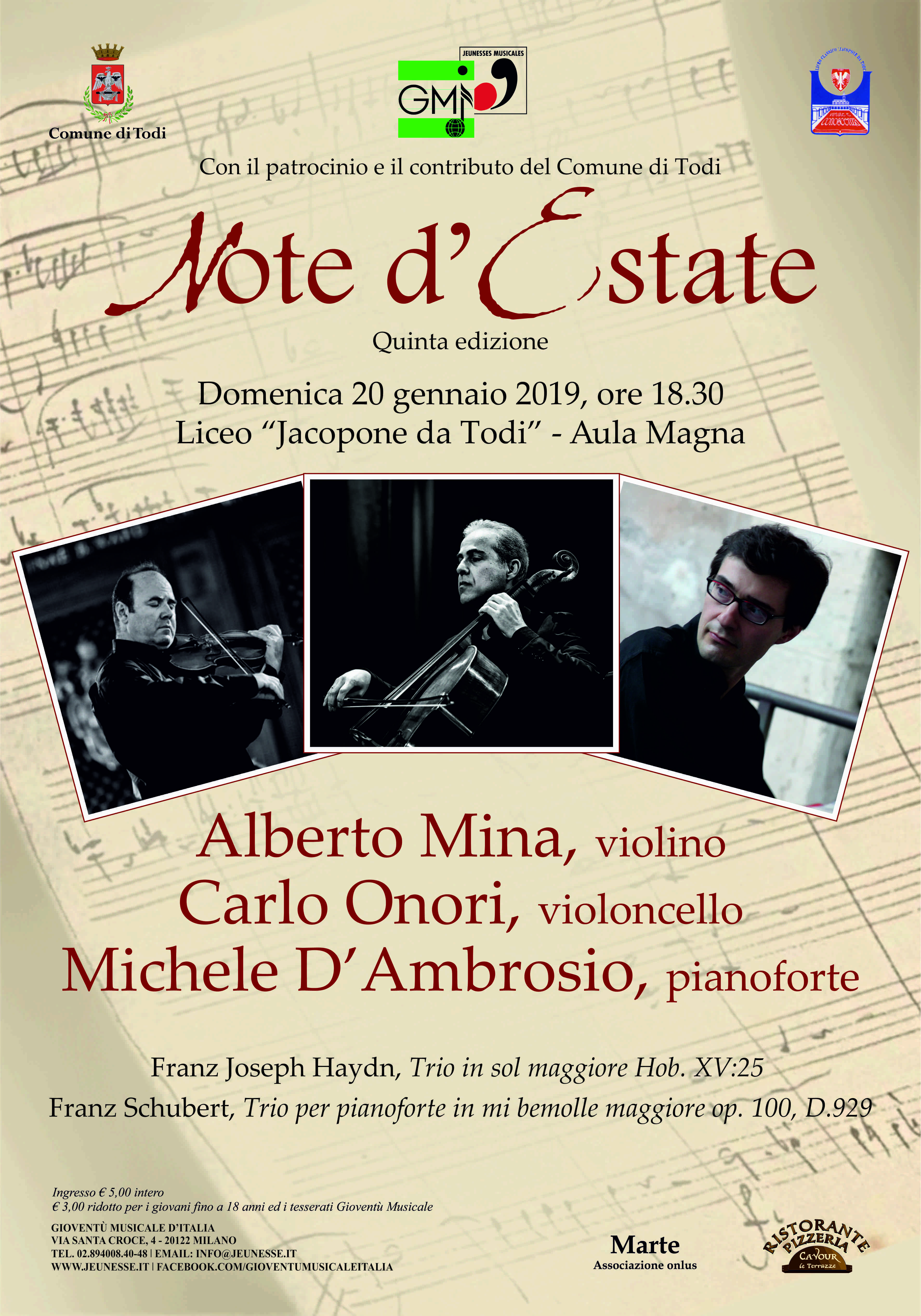 Domenica 20 gennaio, nella splendida cornice dell’aula magna del Liceo Jacopone da Todi, si è inaugurata la stagione “Note d’Estate” 2019. Questa anteprima si è creata con l’occasione di permettere ai musicisti del Trio di provare il programma che andranno ad incidere in CD a fine mese. Per la città di Todi è stata una magnifica occasione, ascoltare due archi solisti dell’Orchestra di Santa Cecilia ed un bravissimo pianista di fama internazionale. Il Trio, composto dal pianista Michele D ‘Ambrosio, dal violinista Alberto Mina e dal violoncellista Carlo Onori, ci ha regalato un bellissimo concerto conclusosi con il famosissimo Trio di Franz Schubert in mi b maggiore op.100. Questo Trio fu usato nel film “Barry Lindon” da Stanley Kubrik come colonna sonora, film che vinse l’Oscar. Il concerto comprendeva anche il Trio in Sol maggiore Hob. XV:25 di Fran Joseph Haydn. Il pubblico dell’aula magna, al completo, ha applaudito a lungo e i musicisti hanno ringraziato e salutato il pubblico con un bis bellissimo di Elgar del quale alleghiamo l’audio.